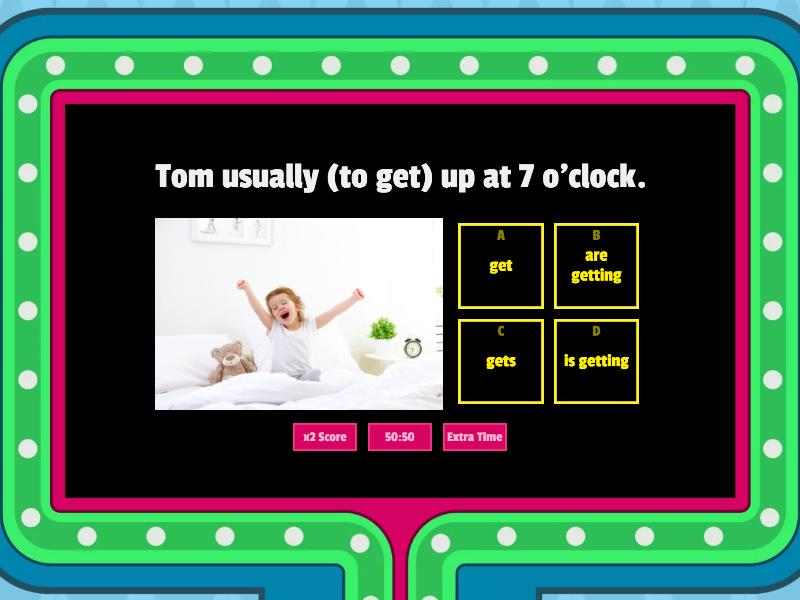 1) Tom usually (to get) up at 7 o'clock. a) get b) are getting c) gets d) is getting 2) She (to feed) her cat every day. a) feed b) feeds c) is feeding d) are feeding 3) He often (to go) to the cinema. a) go b) goes c) is going d) are going 4) We (to watch) TV at the moment. a) is watching b) watch c) watches d) are watching 5) Don't cry! The baby (sleep). a) sleep b) is sleeping c) sleeps d) are sleeping 6) Look at Paul! He (to play) football. a) is playing b) are playing c) play d) plays 7) dancing a) to be proud of b) to be fond of c) to be scared of 8) paper a) to be made of b) be scared of c) to be proud of