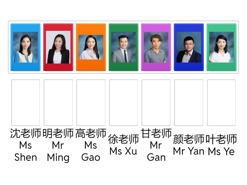 明老师 Mr Ming, 徐老师 Ms Xu, 叶老师 Ms Ye, 甘老师 Mr Gan, 颜老师 Mr Yan, 高老师 Ms Gao, 沈老师 Ms Shen,