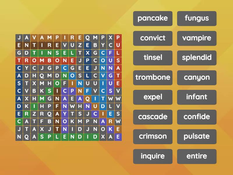 crimson - crimson, canyon - canyon, trombone - trombone, confide - confide, entire - entire, expel - expel, inquire - inquire, splendid - splendid, pancake - pancake, pulsate - pulsate, convict - convict, infant - infant, cascade - cascade, vampire - vampire, tinsel - tinsel, fungus - fungus,