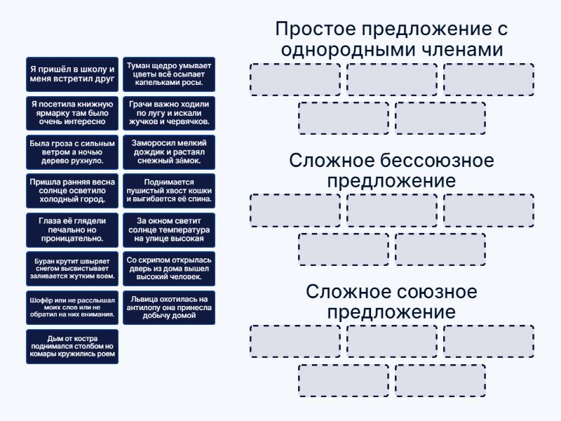 Простое предложение с однородными членами: Глаза её глядели печально но проницательно., Буран крутит швыряет снегом высвистывает заливается жутким воем., Шофёр или не расслышал моих слов или не обратил на них внимания., Грачи важно ходили по лугу и искали жучков и червячков., Туман щедро умывает цветы всё осыпает капельками росы., Сложное бессоюзное предложение: Пришла ранняя весна солнце осветило холодный город., Со скрипом открылась дверь из дома вышел высокий человек., Я посетила книжную ярмарку там было очень интересно, За окном светит солнце температура на улице высокая, Львица охотилась на антилопу она принесла добычу домой, Сложное союзное предложение: Дым от костра поднимался столбом но комары кружились роем, Была гроза с сильным ветром а ночью дерево рухнуло., Поднимается пушистый хвост кошки и выгибается её спина., Заморосил мелкий дождик и растаял снежный за́мок., Я пришёл в школу и меня встретил друг,