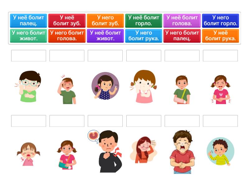 У него болит горло., У неё болит горло., У неё болит живот., У него болит живот., У него болит палец., У неё болит палец., У него болит зуб., У неё болит зуб., У него болит рука., У неё болит рука., У неё болит голова., У него болит голова.,