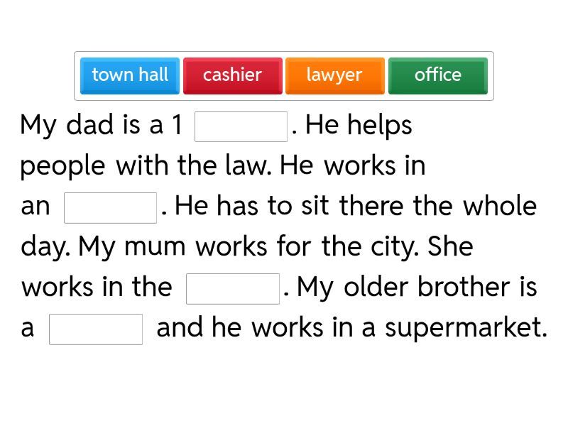 My dad is a 1 ____. He helps people with the law. He works in an ____. He has to sit there the whole day. My mum works for the city. She works in the ____. My older brother is a ____ and he works in a supermarket. My dad is a ____. He goes to people’s houses and fixes ____ in the kitchens and bathrooms. My mum is a ____.She looks after patients in ____.