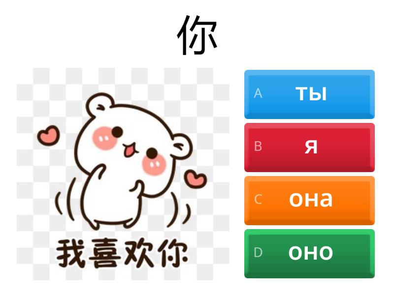 1) 你 a) ты b) я c) она d) оно 2) 我 a) мое b) он c) я d) наш 3) 他 a) вы b) она c) он d) они 4) 她 a) он b) их c) оно d) она 5) 他们 a) они b) мы c) их d) ваш 6) 我们 a) мы b) я c) нащ d) вы 7) 你们 a) мы b) они c) вы d) ваш