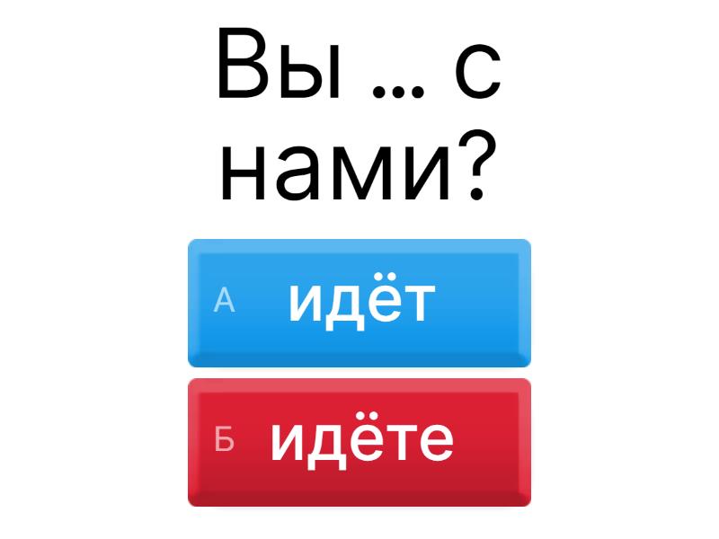 1) Вы ... с нами? a) идёт b) идёте 2) Я ... в школу каждый день кроме выходных. a) хожу b) идУ 3) Валера, ... сегодня к друзьям? a) идёт b) ХОдит c) идёшь 4) КудА ты сейчас ... ? a) ходить b) идёшь c) хОдишь 5) Мы никогда не ... на рынок. a) ХОдим b) идём 6) Нина и Ирина обычно ... на станцию метро. a) ХОдят b) идУт 7) Мальчик, ты ... пешком? a) ХОдит b) идёт c) идёшь 8) Куда вы ... этим вечером? a) ходите  b) идёте 9) Мы чАсто ________ в цЕнтр a) хОдим b) идём  10) Я не люблЮ _______ пешком a) идтИ b) ходИть c) хожу d) иду 11) Он никогда не ... в клубы a) идёт b) ходит 12) - КудА ты сейчАс ... ? - В кино или в театр? a) идёшь b) хОдишь c) идёт