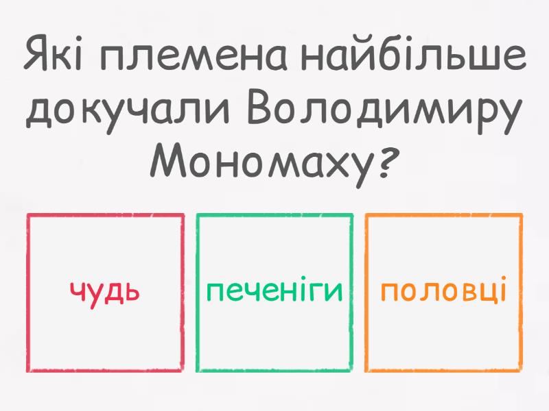 1) Які племена найбільше докучали Володимиру Мономаху? a) чудь b) печеніги c) половці 2) У якому році скликано Любецький з'їзд князів та з чиєї ініциативи? a) Володимира Мономаха b) Всеволода c) 1097 році d) 1112 році 3) Укажіть портрет Володимира Мономаха a) b) c) 4) Принцип володіння землями батька-це... a) вотчина b) уділ c) тріумвірат 5) Володимир Мономах правив з... a) 14 років b) 17 років c) 15 років d) 28 років 6) Кияни запросили Мономаха на престол у... a) 1113 році b) 1114 році c) 1111 році 7) Перша письмова згадка про "Україну" датована a) 1187 b) 1167 c) 1178 8) Автором якого твору був Володимир Мономах? a) "Повчання дітям" b) "Повість минулих літ" c) "Слово про закон і благодать" 9) Прізвище Володимира Мономаха пов'язане  a) з типом хутра його шапки b) з походженням від роду візантійських імператорів c) з одноосібним правлінням у Києві 10) Укажіть мету скликання Любецького з'їзду князів a) Схвалення тексту норм "Правди Ярославичів" b) Подолання князівських міжусобиць c) Обрання великого князя київського d) Затвердження проєкту будівництва Михайлівського Золотоверхого собору
