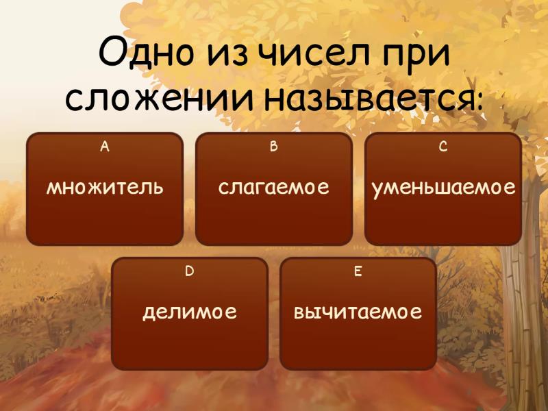 1) Одно из чисел при сложении называется: a) множитель b) слагаемое c) уменьшаемое d) делимое e) вычитаемое 2) Результат сложения называется: a) частное b) произведение c) сумма d) разность 3) Число, от которого отнимают называется: a) делитель b) вычитаемое c) уменьшаемое d) разность e) множитель 4) Найди лишнее слово: a) разность b) делитель c) делимое d) частное 5) Чтобы найти неизвестное слагаемое, надо: a) к вычитаемому прибавить разность b) из суммы вычесть слагаемое c) к сумме прибавить слагаемое d) делимое разделить на частное 6) Чтобы найти уменьшаемое: a) прибавить к разности вычитаемое b) разделить делимое на частное c) умножить разность на вычитаемое d) вычесть из разности вычитаемое 7) Чтобы найти вычитаемое: a) сложить уменьшаемое и разность b) вычесть из уменьшаемого разность c) разделить делимое на частное d) вычесть из суммы слагаемое 8) Чтобы найти неизвестный множитель, надо: a) делимое разделить на частное b) частное умножить на делитель c) от суммы отнять слагаемое d) произведение разделить на множитель