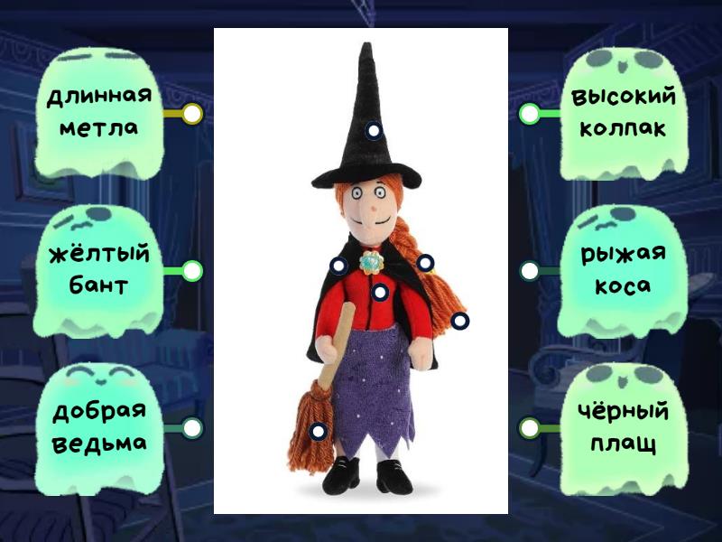 высокий колпак, рыжая коса, длинная метла, добрая ведьма, чёрный плащ, жёлтый бант.