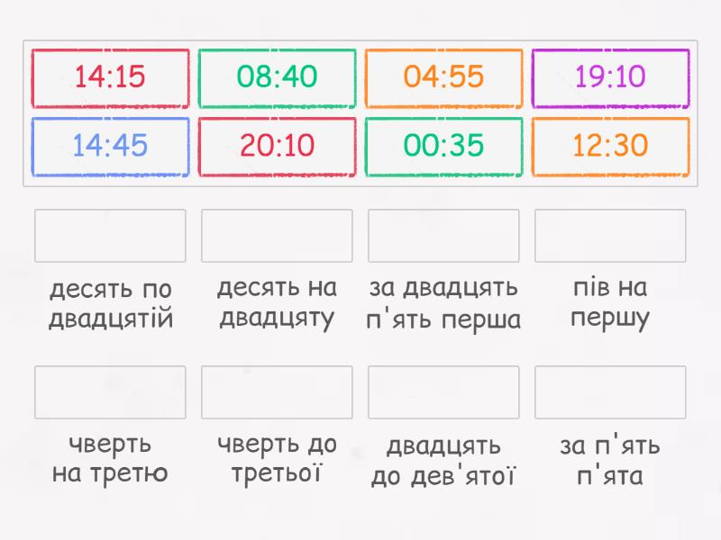 12:30 - пів на першу, 14:45 - чверть до третьої, 14:15 - чверть на третю, 08:40 - двадцять до дев'ятої, 04:55 - за п'ять п'ята, 19:10 - десять на двадцяту, 20:10 - десять по двадцятій, 00:35 - за двадцять п'ять перша,