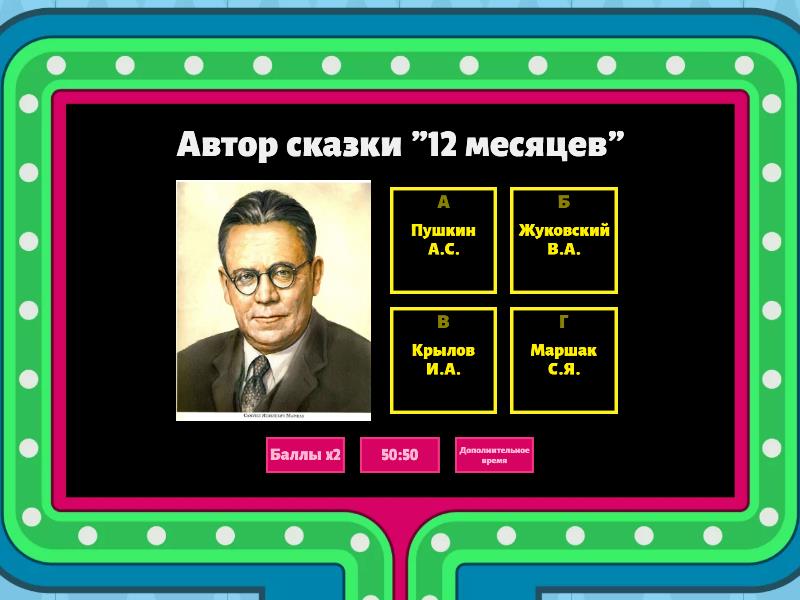 1) Автор сказки "12 месяцев" a) Пушкин А.С. b) Жуковский В.А. c) Крылов И.А. d) Маршак С.Я. 2) Автор "Сказки о мёртвой царевне и семи богатырях" a) Крылов И.А. b) Ломоносов М.В. c) Пушкин А.С. d) Жуковский В.А. 3) Автор сказки "Снежная королева" a) Шарль Перро b) братья Гримм c) Андерсен Х.К. d) Э. Гофман 4) Автор басни "Ворона и лисица" a) Жуковский В.А. b) Крылов И.А. c) Пушкин А.С. d) Ломоносов М.В. 5) Автор рассказа "Кавказский пленник" a) Лермонтов М.Ю. b) Чехов А.П. c) Жуковский В.А. d) Толстой Л.Н. 6) Автор стихотворения "Бородино" a) Некрасов Н.А. b) Лермонтов М.Ю. c) Фет А.А. d) Ломоносов М.В. 7) Автор повести "Том Сойер" a) Андерсен Х.К. b) братья Гримм c) Ш. Перро d) Марк Твен 8) Автор сказа "Медной горы Хозяйка" a) Плещеев А.Н. b) Жуковский В.А. c) Бажов П.П. d) Тютчев Ф.И. 9) Автор сказки "Чёрная курица, или подземные жители" a) Жуковский В.А. b) Погорельский А. c) Пушкин А.С. d) Гоголь Н.В. 10) Автор сказки "Царевна-лягушка" a) Крылов И.А. b) Жуковский В.А. c) Толстой Л.Н. d) русская народная сказка
