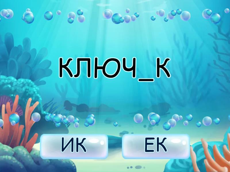 ИК: КЛЮЧ_К, ПРЯН_К, КАРАНДАШ_К, ХОЛМ_К, КОЛОКОЛЬЧ_К, ПЛАЩ_К, ДВОР_К, СЛОВАР_К, МЯЧ_К, ЕК: ЗВОНОЧ_К, ДЕНЁЧ_К, НОЖИЧ_К, МОЛОТОЧ_К, ЗАМОЧ_К, ГРИБОЧ_К, КУСОЧ_К, МЕШОЧ_К, ДОЖДИЧ_К, УГОЛЁЧ_К,