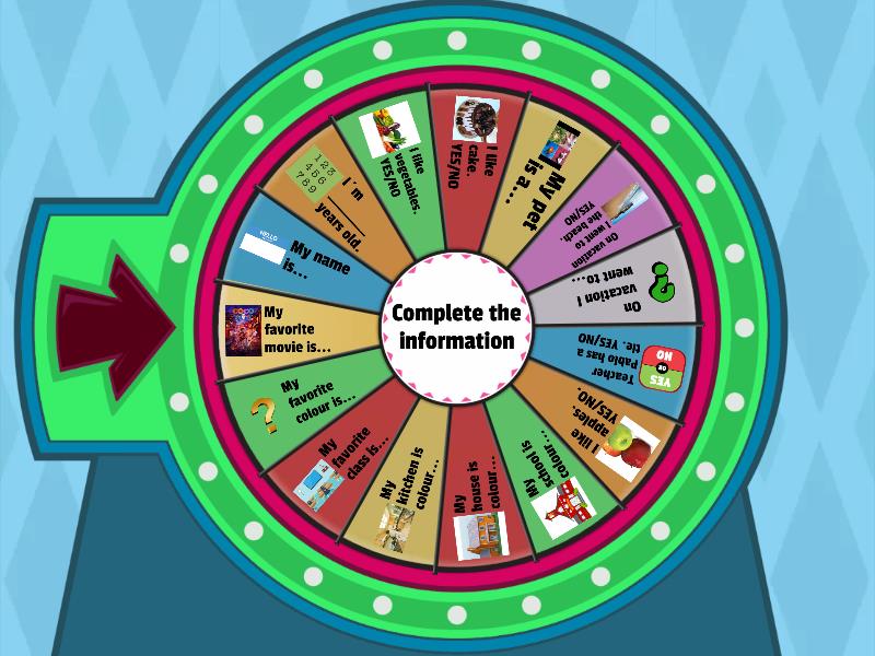 My name is..., I´m ________ years old., I like vegetables. YES/NO, I like cake. YES/NO, My pet is a..., On vacation I went to the beach. YES/NO, On vacation I went to..., Teacher Pablo has a tie. YES/NO, I like apples. YES/NO., My school is colour..., My house is colour..., My kitchen is colour..., My favorite class is..., My favorite colour is..., My favorite movie is....