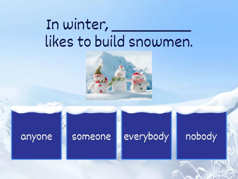 1) In winter, __________ likes to build snowmen.  a) anyone b) someone c) everybody d) nobody 2) I can't find my scarf __________. Have you seen it? a) somewhere b) anywhere c) nowhere d) everywhere 3) There's __________ better than a warm fireplace on a cold evening. a) nothing b) everything c) something d) anything 4) We usually celebrate New Year's Eve __________ special. a) anywhere b) nowhere c) everywhere d) somewhere 5) Is there __________ who can make delicious gingerbread cookies? a) somebody b) no one c) everybody d) anybody 6) I left my hot chocolate __________. I have no idea where. a) nowhere b) somewhere c) anywhere d) everywhere. 7) Look! __________ enjoys this Christmas party. They are all glued to their phones.  a) Everybody b) Somebody c) Anybody d) Nobody 8) There's __________ exciting about the Christmas market of Bekescsaba. It's the same every year.  a) everything b) something c) nothing d) anything 9) We are all very competitive. For this reason, __________ wants to join the ice-skating competition. a) everybody b) nobody c) somebody d) anybody 10) We are going on a winter vacation, but __________ knows the destination. a) everybody b) somebody c) nobody d) anybody 11) I have __________ to do during the winter break. It's so boring. a) something b) anything c) nothing d) everything 12) __________ likes to decorate the house with festive lights. In this neighbourhood, we're all crazy about Christmas.   a) Everybody b) No one c) Somebody d) Anybody 13) I don't really want presents this year. I have ____________ I need. a) something b) nothing c) anything d) everything 14) We have _______________ for the stuffed cabbage. You can cross out rice, cabbage leaves and minced pork from the shopping list. a) everything b) nothing c) anything d) something