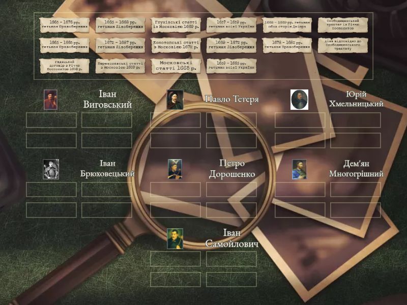 Іван Виговський: Гадяцький договір з Річчю Посполитою 1658 р., 1657 - 1659 рр. гетьман всієї України, Павло Тетеря: 1663 - 1665 рр. гетьман Правобережжя, діяв відповідно до Слободищенського трактату , Юрій Хмельницький: 1659 - 1663 рр. гетьман всієї України, Переяславські статті з Московією 1659 р., Слободищенський трактат із Річчю Посполитою, 1678 - 1682 рр. гетьман Правобережжя, Іван Брюховецький: 1663 - 1668 рр. гетьман Лівобережжя, Московські статті 1665 р., Петро Дорошенко: 1665 - 1676 рр. гетьман Правобережжя, 1668 - 1669 рр. гетьман обох сторін Дніпра, Дем'ян Многогрішний: 1669 - 1672 рр. гетьман Лівобережжя, Глухівські статті із Московією 1669 р., Іван Самойлович: 1672 - 1687 рр. гетьман Лівобережжя, Конотопські статті з Московією 1672 р.,