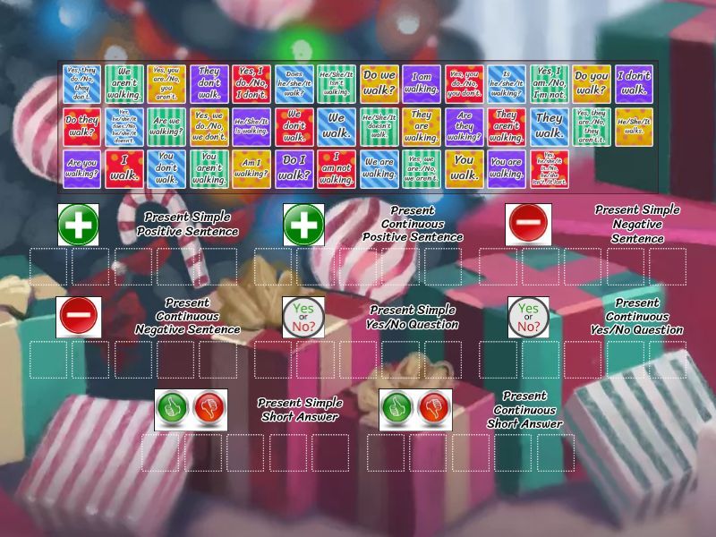 Present Simple Positive Sentence: I walk., You walk., He/She/It walks., We walk., They walk., Present Continuous Positive Sentence: I am walking., You are walking., He/She/It is walking., We are walking., They are walking., Present Simple Negative Sentence: I don’t walk., You don’t walk., He/She/It doesn’t walk., We don’t walk., They don’t walk., Present Continuous Negative Sentence: I am not walking., You aren’t walking., He/She/It isn’t walking., We aren’t walking., They aren’t walking., Present Simple Yes/No Question: Do I walk?, Do you walk? , Does he/she/it walk?, Do we walk?, Do they walk?, Present Continuous Yes/No Question: Am I walking?, Are you walking?, Is he/she/it walking?, Are we walking?, Are they walking?, Present Simple Short Answer: Yes, I do./No, I don’t., Yes, you do./No, you don’t., Yes, he/she/it does./No, he/she/it doesn’t., Yes, we do./No, we don’t., Yes, they do./No, they don’t., Present Continuous Short Answer: Yes, I am./No, I’m not., Yes, you are./No, you aren’t., Yes, he/she/it is./No, he/she isn't./it isn’t., Yes, we are./No, we aren’t., Yes, they are./No, they aren’t.t.,