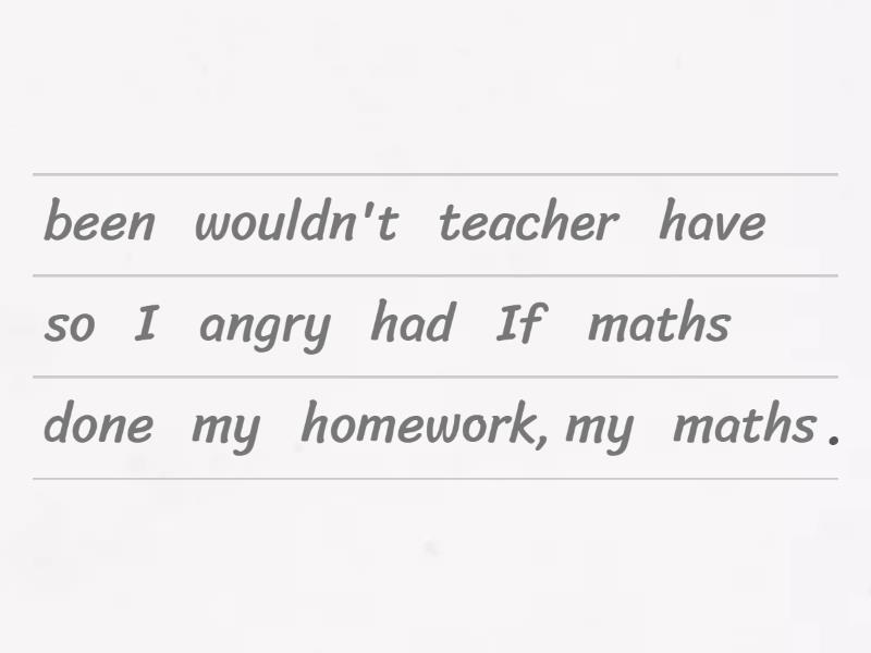 If I had done my maths homework, my maths teacher wouldn't have been so angry., If you had taken your packed lunch to school, you wouldn't have had to pay so much ., If I had set the alarm clock, I would have woken up on time., If you had won the lottery, you would have bought the tickets., If you had learnt English on a regular basis, you would have applied for that job.,