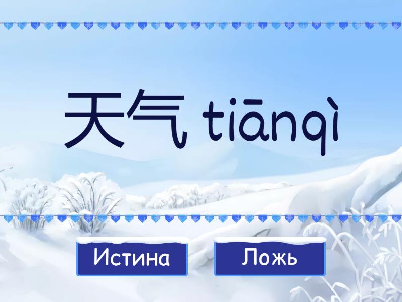 Истина: 天气 tiānqì, 怎么样 zěnmeyàng, 不太 bútài, 太...了 tài...le, 热 rè, 冷 lěng, 下雨 xiàyǔ, 小姐 xiǎojie, 来 lái, 身体 shēntǐ, 爱 ài, 些 xiē, 水果 shuǐguǒ, 水 shuǐ, Ложь: 天气 tiānqi, 怎么样 zénmeyàng, 不太 bùtài, 太...了 tái...le, 热 ré, 冷 lèng, 下雨 xiàyú, 小姐 xiǎojiě, 来 lài, 身体 shēntí, 爱 āi, 些 xiě, 水果 shuíguó, 水 shuí,