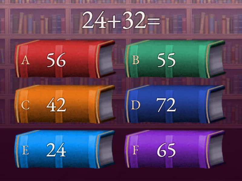 1) 24+32= a) 56 b) 55 c) 42 d) 72 e) 24 f) 65 2) 77+10= a) 78 b) 2 c) 87 d) 86 e) 88 f) 67 3) 10+10+11= a) 22 b) 11 c) 10 d) 1 e) 31 f) 45 4) 26+26= a) 52 b) 50 c) 1 d) 2 e) 3 f) 4 5) 0-0= a) 0 b) 1 c) 00000000001 d) 101 e) 2 f) 10 6) 22-20= a) 12 b) 20 c) 42 d) 2 e) 3 f) 22 7) English a) 1 b) 2 c) 3 d) 4 e) 5 f) 6 8) what is the correct spelling a) wich b) wch c) ich d) witch e) witc f) wih 9) what does puzzled mean a) happy b) sad c) confused d) mad e) calm f) sleepy 10) what does appetite mean? a) play b) water c) food,what you eat d) chair e) super hot f) cold 11) What is the correct spelling a) aait b) ait c) ate d) ati e) tai f) aiegt 12) Read ' Little Red Riding Hood ' Who does Little Red Riding Hood meet on her way to Grandma ?Little Red Riding Hood a) grandma b) a wolf c) a woodcutter d) her parents e) a cupboard f) cupcakes 13) Who comes to save Grandma and Little Red Riding Hood? a) grandma b) a wolf c) a cupboard d) woodcutter e) cupcakes f) her parents