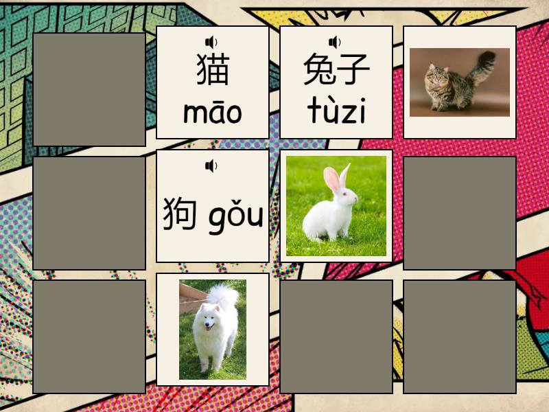 猫 māo, 狗 gǒu, 兔子 tùzi, 仓鼠 cāngshǔ, 鸟 niǎo, 鱼 yú,