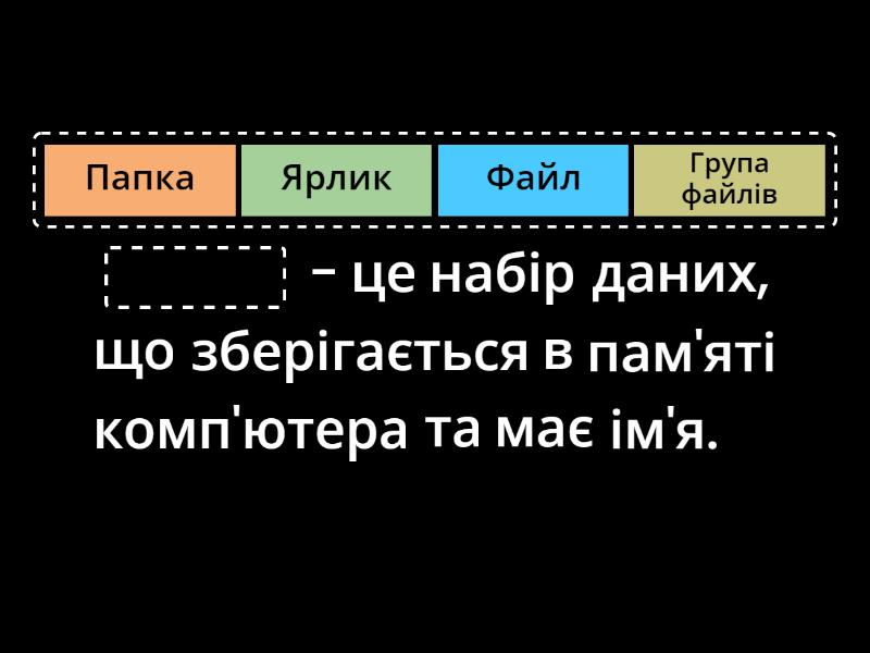 ____ - це набір даних, що зберігається в пам'яті комп'ютера та має ім'я. ____ - контейнер для файлів. Нову папку можна створити через команду ____ Ім'я файлу складається з ____ частин, які розділені символом ____