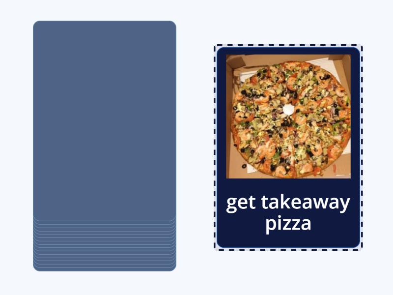 have eggs for breakfast, get takeaway pizza, buy new clothes, be in a hurry, watch TV at lunchtime, get up early on Sundays, walk to class/work, sleep ten hours at night, be tired in the morning, have a bath, be stressed, do exercise, watch films in English, cook for your friends, have breakfast in bed, eat fruit, have dinner in a restaurant.