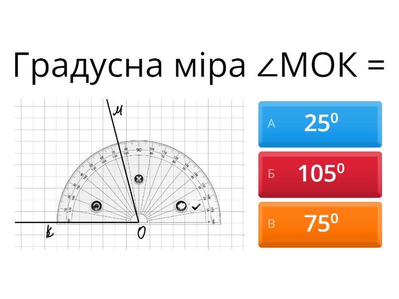 1) Градусна міра ∠МОК =  a) 250 b) 1050 c) 750 2) Градусна міра ∠АВС =  a) 1200 b) 600 c) 870 3) Градусна міра ∠КМN =  a) 900 b) 1800 c) 250 4) Градусна міра ∠NОP =  a) 1300 b) 500 c) 1250 5) Градусна міра ∠SQP =  a) 1450 b) 1350 c) 470 6) Назви кут  a) ∠ОРМ b) ∠МРО c) ∠МОР 7) Назви кут  a) ∠КТР b) ∠РТК c) ∠КРТ 8) Назви кут  a) ∠FKM b) ∠KVF c) ∠MFK 9) Знайди градусну міру ∠DOC a) 650 b) 1800 c) 250 10) Знайди градусну міру ∠АОВ a) 350 b) 600 c) 1500