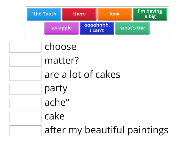 there - are a lot of cakes, look - after my beautiful paintings, an apple - cake, what's the - matter?, oooohhhh, i can't - choose, I'm having a big - party, "the Tooth - ache",
