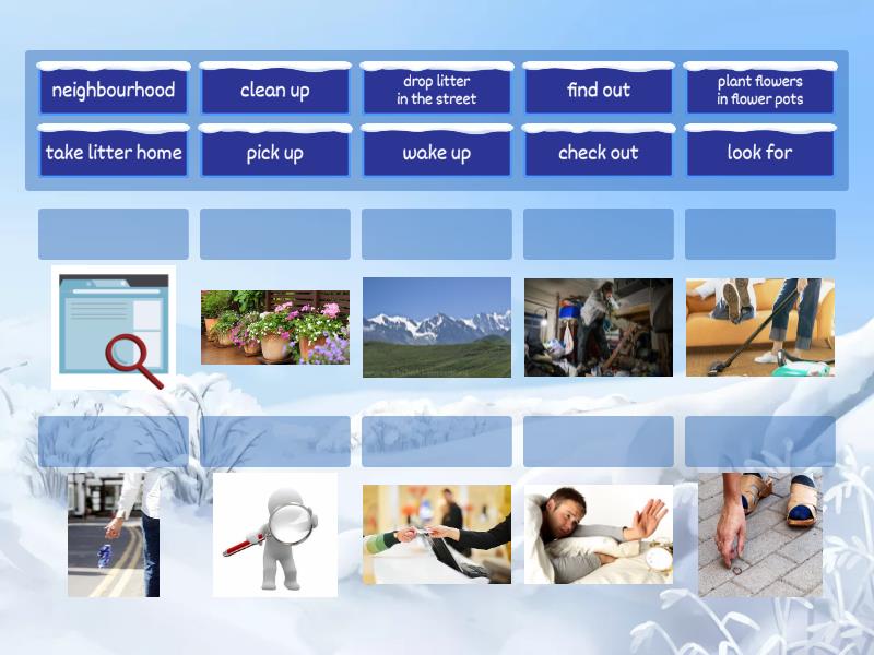 check out, clean up, find out, look for, wake up, take litter home, neighbourhood, drop litter in the street, pick up, plant flowers in flower pots,