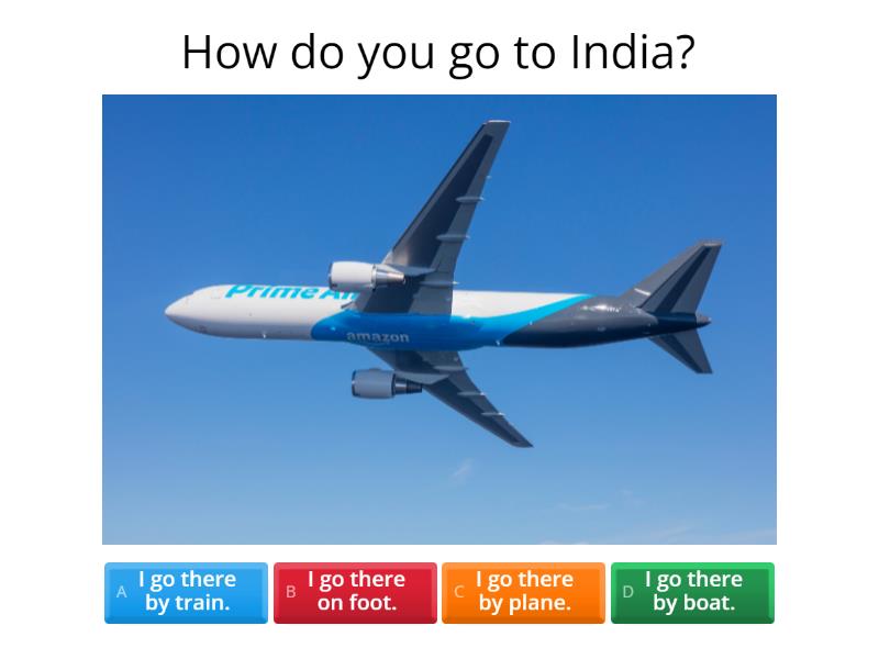 1) How do you go to India? a) I go there by train. b) I go there on foot. c) I go there by plane. d) I go there by boat. 2) ________ do they go to Grandma's house? a) Where b) How c) What d) When 3) I go home _______________. a) by car b) on foot c) by bus d) by plane 4) How _________ she go to the theter? a) is b) do c) am d) does 5) He ______ to the post office by scooter a) goes b) go c) ride d) take 6) How _______ Jack and Jenny ________ to the USA? a) do, go b) does, go c) does, goes d) do, goes 7) I ________ a bike to the park. a) take b) ride c) walk 8) Does Mr. Chen _________ to the coffee shop by car? a) goes b) go c) want 9) Do you go to Green Island by boat? a) Yes, I am. b) No, I isn't. c) No, I don't. d) Yes, I does. 10) Which one is wrong(錯誤)? a) They go to KFC by foot. b) She goes to the bakery by scooter. c) I drive a car to New York. d) I go to school by bus.