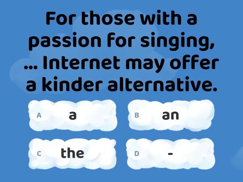 1) For those with a passion for singing, ... Internet may offer a kinder alternative. a) a b) an c) the d) - 2) I've recovered completely. In ... fact, I feel super. a) a b) an c) the d) - 3) One of many vintage cars are on ... display. a) a b) an c) the d) - 4) I'd like to make ... appointment with Doctor Evans, please. a) a b) an c) the d) - 5) When Romeo met Juliet, it was love at ... first sight. a) a b) an c) the d) - 6) I've recovered completely. In ... fact, I feel super. a) a b) an c) the d) - 7) She demanded payment in ... advance. a) a b) an c) the d) - 8) Monday was Nick's first day at the National Trust Bank. He wanted to make ... good impression. a) a b) an c) the d) - 9) It was love at ... first sight. a) a b) an c) the d) - 10) Your order will be sent free of ... charge. a) a b) an c) the d) - 11) She doesn't believe in love at ... first sight. a) a b) an c) the d) - 12) In ... fact, the more hectic the lifestyle you lead, the more you will benefit from a workout! a) a b) an c) the d) - 13) Jen and I never kept in ... touch after college. a) a b) an c) the d) - 14) You can even save money by booking in ... advance. a) a b) an c) the d) - 15) When Chris met Susan it was love at ... first sight. a) a b) an c) the d) - 16) She is not joking. In ... fact, she's dead serious. a) a b) an c) the d) - 17) You should make ... use of your contacts. a) a b) an c) the d) - 18) At ... present she's working abroad. a) a b) an c) the d) - 19) They fell in love at ... first sight when they met at their friends' wedding. a) a b) an c) the d) - 20) I think about going back to school from ... time to time. a) a b) an c) the d) - 21) The palace and its grounds are open to ... public during the summer months. a) a b) an c) the d) - 22) In ... fact, they are on very good terms with their next-door neighbours. a) a b) an c) the d) - 23) Please contact my secretary to make ... appointment. a) a b) an c) the d) - 24) In ... fact, many titles often appear online at the same time as the printed books are published. a) a b) an c) the d) - 25) It's a shame that teachers don't make ... use of the new computer lab. a) a b) an c) the d) - 26) She tried to make ... good impression on the interviewer. a) a b) an c) the d) - 27) You can download the materials free of ... charge from our website. a) a b) an c) the d) - 28) I'm sure you'll find some information about it on ... Internet. a) a b) an c) the d) - 29) The classes are offered free of ... charge. a) a b) an c) the d) - 30) I'd like to make ... appointment to see the doctor, please. a) a b) an c) the d) - 31) Make sure you book in ... advance though, as these are very popular, particularly with families. a) a b) an c) the d) - 32) The college does a beginners' course on how to use ... Internet. a) a b) an c) the d) - 33) Could you make ... appointment with the secretary for next week? a) a b) an c) the d) - 34) We would have a meal there from time to ... time. a) a b) an c) the d) -