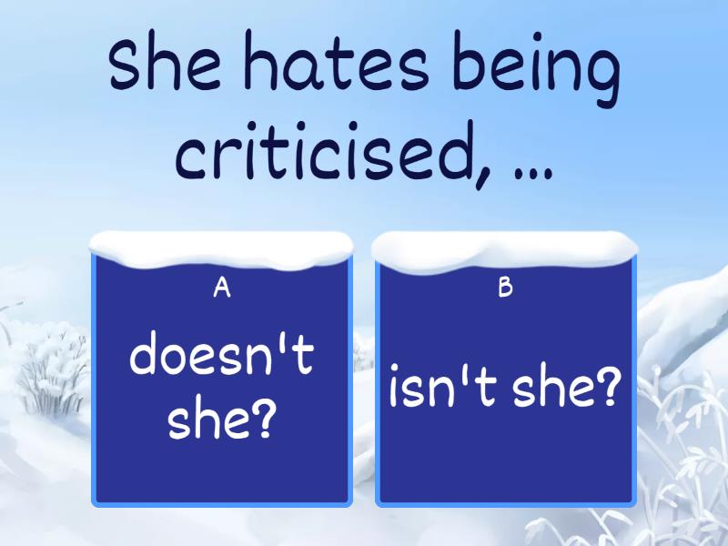 1) She hates being criticised, ... a) doesn't she? b) isn't she? 2) Don't buy the first coat you see, ... a) will you? b) won't you? 3) I'm the last to arrive, ... a) don't I? b) aren't I? 4) Nobody in the complaints department helped you, ... a) did they? b) didn't they? 5) There wasn't anything affordable in that shop, ... a) was it? b) was there? 6) He's just placed his order, ... a) hasn't he? b) didn't he? 7) You've forgotten to post my letters, ... a) have you? b) haven't you? 8) I think I'm going to have to start again from the beginning, ... a) aren't I? b) am I? 9) No matter what we do, nothing will change, ... a) won't it? b) will it? 10) Don't get lost, ... a) will you? b) won't you? 11) I guess there'll be no buses going to Woodside on New Year's Day, ... a) will it? b) will there? 12) Everybody loves chocolate cake, ... a) doesn't he/she? b) don't they? 13) Nobody's in the changing room at the moment, ... a) aren't they? b) are they? 14) Let's get something to eat first, ... a) let we? b) shall we?