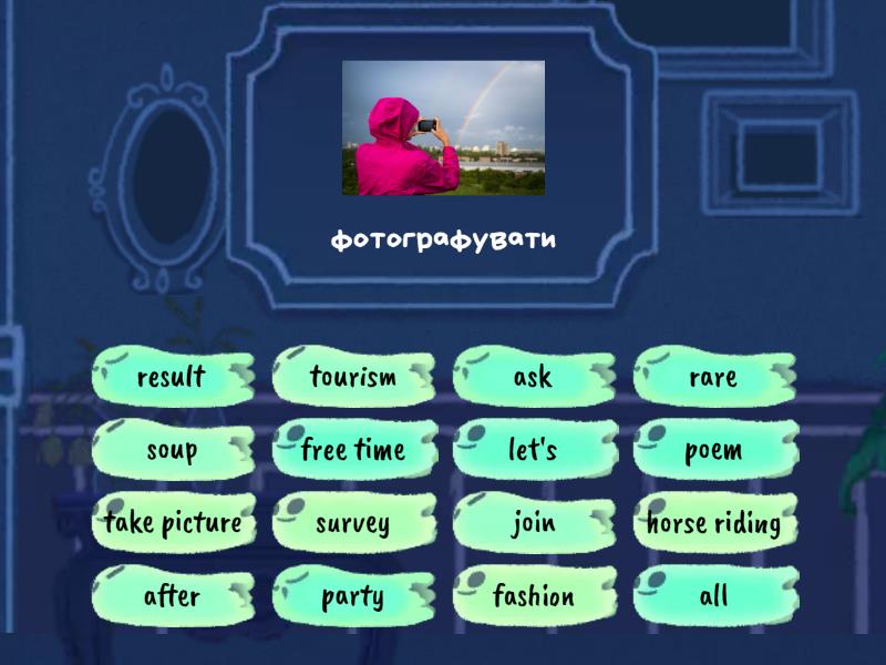 take picture - фотографувати, ask - запитувати, join - приєднуватися, free time - вільний час, survey - опитування, result - результат, soup - суп, poem - вірш, fashion - мода, party - вечірка, tourism - туризм, all - усі, horse riding - кінний спорт/ верхова їзда, rare - рідкісний , after - після, let's - нумо / давай,