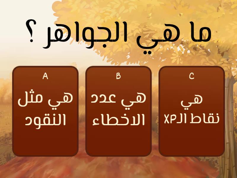 1) ما هي الجواهر ؟ a) هي مثل النقود b) هي عدد الاخطاء c) هي نقاط الـXP 2) كم عدد الاخطاء التي تستطيع ارتكابها اثناء التعلم ؟ a) 10 b) 3 c) 5 3) هل يمكن تعلم لغتين في آنٍ واحد ؟ a) نعم b) لا 4) (السؤال) هو الخطوة ذات الرقم ....؟ a) 1 b) 2 c) 3
