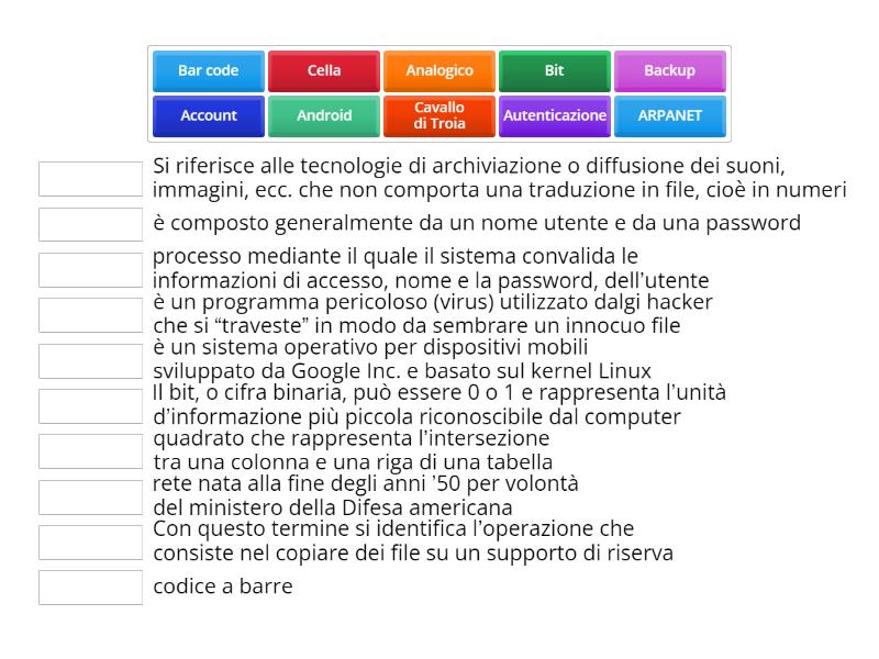 Account - è composto generalmente da un nome utente e da una password, Analogico - Si riferisce alle tecnologie di archiviazione o diffusione dei suoni, immagini, ecc. che non comporta una traduzione in file, cioè in numeri, Android - è un sistema operativo per dispositivi mobili sviluppato da Google Inc. e basato sul kernel Linux, ARPANET - rete nata alla fine degli anni ’50 per volontà del ministero della Difesa americana, Autenticazione - processo mediante il quale il sistema convalida le informazioni di accesso, nome e la password, dell’utente, Backup - Con questo termine si identifica l’operazione che consiste nel copiare dei file su un supporto di riserva, Bar code - codice a barre, Bit - Il bit, o cifra binaria, può essere 0 o 1 e rappresenta l’unità d’informazione più piccola riconoscibile dal computer, Cavallo di Troia - è un programma pericoloso (virus) utilizzato dalgi hacker che si “traveste” in modo da sembrare un innocuo file, Cella - quadrato che rappresenta l’intersezione tra una colonna e una riga di una tabella,