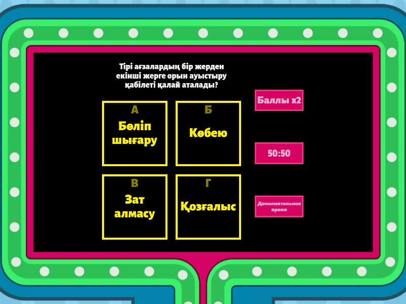 1) Тірі ағзалардың бір жерден екінші жерге орын ауыстыру қабілеті қалай аталады? a) Бөліп шығару b) Көбею c) Зат алмасу d) Қозғалыс 2) Омыртқалы жануарлардың омыртқасыз жануарлардан айырмашылығы шеміршек пен сүйектен тұратын ... болады. a) Экзоқаңқасы b) Гидростатикалық қаңқасы c) Эндоқаңқасы d) Бұлшықеті 3) Кәдімгі амебаның қозғалу мүшесін тап a) Кірпішке b) Талшық c) Жүзбеқанат d) Жалғанаяқ 4) Жасыл эвгленаның қозғалу a) Бұлшықет b) Кірпікше c) Жалғанаяқ d) Талшық 5) Балықтың алға қарай жылжуы үшін қандай жүзбеқанаттың басты рөл атқаратынын анықта? a) Көкірек жүзбеқанаты b) Құйрық жүзбеқанаты c) Құрсақ жүзбеқанаты d) Арқа жүзбеқанаты 6) Құстың ұшуға бейімделген мүшесін анықта a) Тері жамылғы b) Түк c) Тұмсығындағы тісі d) Алдыңғы аяғы-қанат