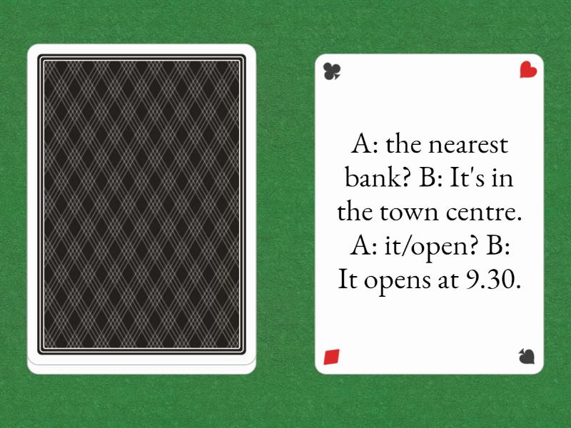 A: 'tiny' / mean? What does tiny mean? B: It means very, very small. A: you/spell/? B: T-I-N-Y., A: do/weekend? B: On Saturday I played football. A: you / win? B: No, we lost 4-2., A: the nearest bank? B: It's in the town centre. A: it/open? B: It opens at 9.30..