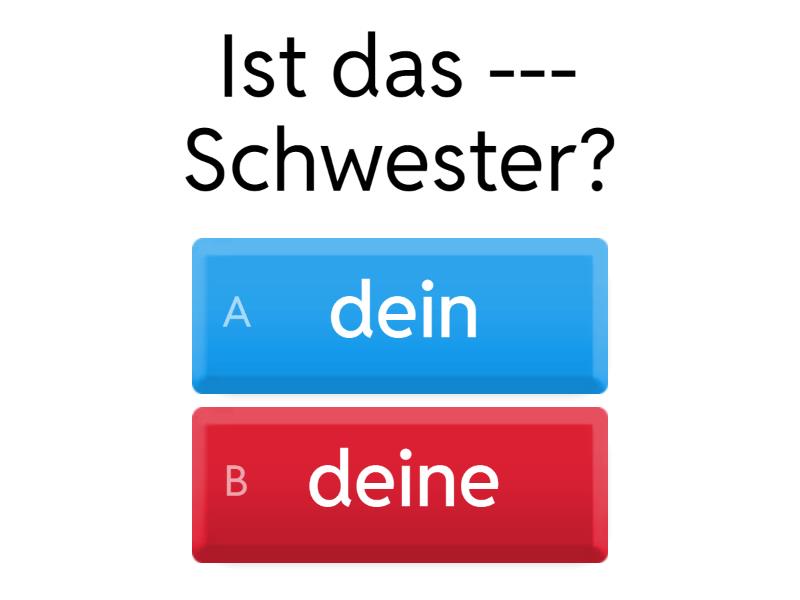 1) Ist das --- Schwester? a) dein b) deine 2) Das sind --- Freunde Jonas und Paul. a) mein b) meine 3) --- Bruder ist okay. a) Mein b) Meine 4) --- Mutter ist 44 Jahre alt. a) Meine b) Mein 5) Wo ist denn --- Heft? a) dein b) deine 6) Ist das --- Block? a) deine b) dein 7) Nein, das ist nicht --- Block. a) mein b) meine 8) Sind das --- Freunde? a) dein b) deine 9) Wo ist --- Freundin? a) deine b) dein 10) Wo sind --- Geschwister? a) deine b) dein 11) Wie alt ist --- Oma? a) dein b) deine 12) Das ist nicht --- Tasche. a) meine b) mein 13) --- Eltern sind nicht zu Hause. a) Mein b) Meine 14) Wie heisst --- Onkel? a) dein b) deine 15) --- Opa spielt gern Monopoly. a) Meine b) Mein 16) --- Cousine wohnt in Wien. a) Meine b) Mein 17) Wo wohnt --- Cousin? a) dein b) deine 18) --- Tante hat zwei Kinder. a) Mein b) Meine