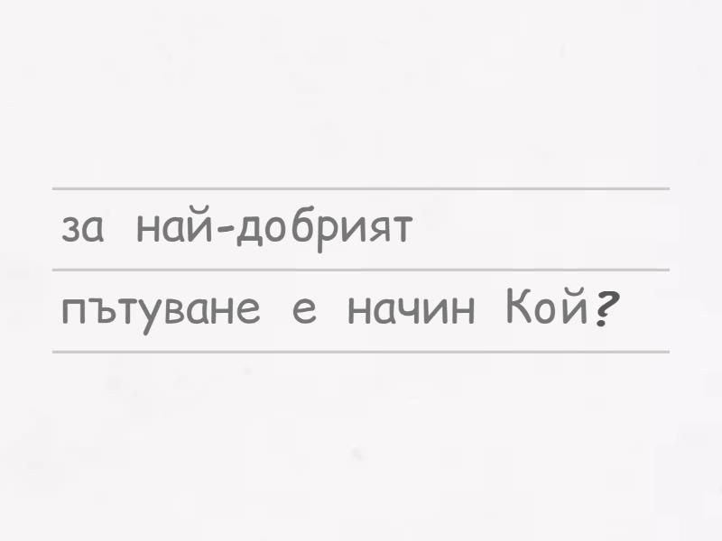Кой е най-добрият начин за пътуване?, В кои страни сте били?, Можете ли да готвите?, Обичате ли да готвите?, Коя е любимата ви храна?,