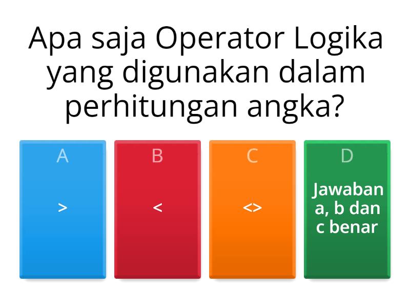 1) Apa saja Operator Logika yang digunakan dalam perhitungan angka? a) > b) < c) <> d) Jawaban a, b dan c benar