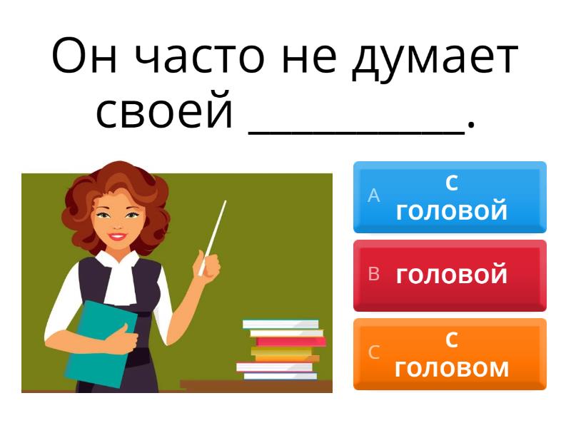1) Он часто не думает своей __________. a) с головой b) головой c) с головом 2) Я ходил на обед ______________. a) с другом b) с другой c) другом 3) Он будет завтра гулять ________________. a) с собакеем b) с собаком c) с собакой 4) Вчера мы ходили в кино _____________. a) ним b) с ним c) с им 5) В понедельник вы должны пойти __________. a) нами b) с нами c) с наш 6) Летом мы обычно ездим ___________ на дачу. a) с сестрой b) с сестром c) с сестрей 7) Я встречалась _____________. a) папа b) с папом c) с папой 8) Он познакомился ______________. a) с поварой b) поваром c) с поваром 9) Я люблю говорить о фильмах _________________. a) Александром b) с Александром c) Александру 10) Я умываю лицо ___________ a) с водой b) водой c) годом 11) Я очень люблю азиатскую традицию есть _________ a) палочками b) палочкой c) с палочками 12) Я умею работать __________ и ____________ a) с головой и с рукой b) с головой и с руками c) головой и руками