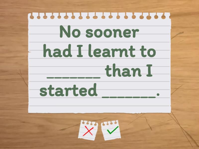 Not only is the plot of (name of a film/ book), (but) it's also _______ because _______, agree/ disagree? Not until you are 18 will your parents treat you like an adult., Never have I ever tried _______ but I would if I had a chance., Never again will I _______, No sooner had I learnt to _______ than I started _______., Not only did I forget to _______, (but) I also forgot to _______, Not until you become a parent yourself do you understand what it's like to _______, I learnt to _______. Only then was I able to _______., Only when you leave home do you realize _______, Hardly had I fallen asleep when _______, Rarely have I met _______ in Global.,