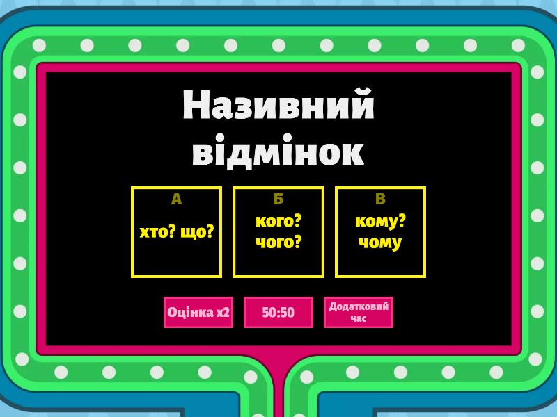 1) Називний відмінок a) хто? що? b) кого? чого? c) кому? чому 2) Родовий відмінок a) хто? що? b) на кому? на чому? c) кого? чого? 3) Давальний відмінок a) кого? чого b) хто? що? c) кому? чому 4) Знахідний відмінок a) ким? чим? b) на кому? на чому? c) кого? що? 5) Орудний відмінок a) кого? чого? b) ким? чим? c) хто? що? 6) Місцевий відмінок a) на кому? на чому? b) хто? що? c) немає питання 7) Окличний відмінок a) звертання b) на кому? на чому? c) кого? чого?