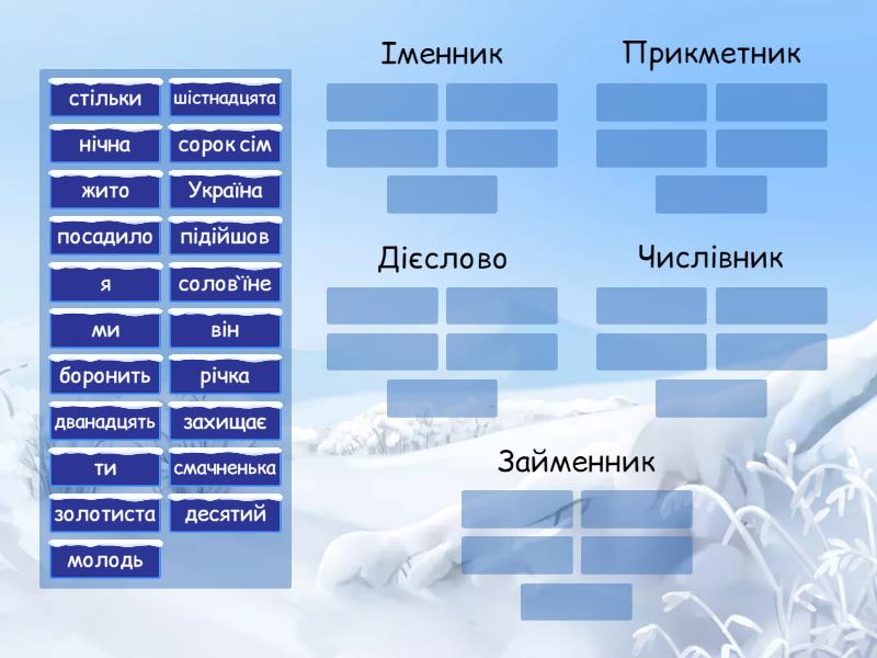 Іменник: жито, Україна, молодь, річка, Прикметник: золотиста, смачненька, нічна, солов`їне, Дієслово: захищає, боронить, підійшов, посадило, Числівник: дванадцять, десятий, сорок сім, шістнадцята, Займенник: я, ти, він, ми, стільки,