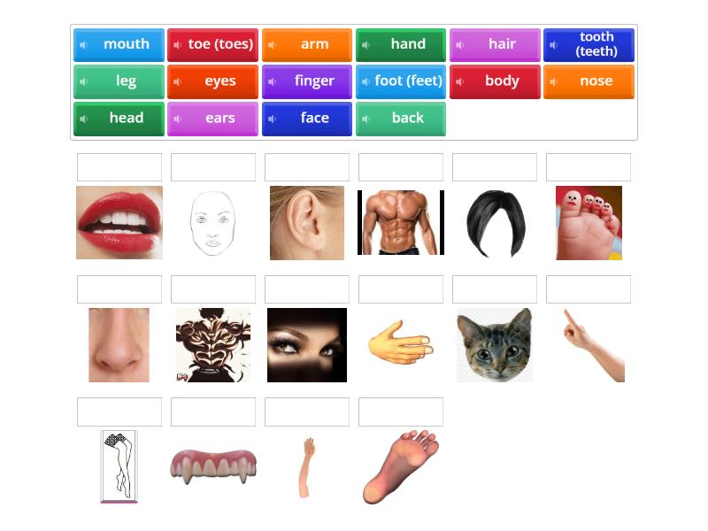 eyes , nose, mouth, ears, head, face, hair, arm, body, leg, hand, foot (feet), back, finger, toe (toes), tooth (teeth),
