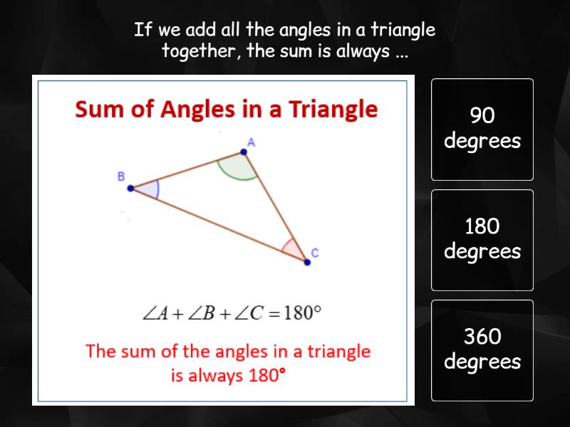 1) If we add all the angles in a triangle together, the sum is always ... a) 90 degrees b) 180 degrees c) 360 degrees 2) The angle sum of a triangle = 180 degrees a) True b) False 3) What is the value of x? a) 50 degrees b) 40 degrees c) 60 degrees 4) What is the value of x? a) 54 degrees b) 44 degrees c) 34 degrees 5) What is the value of x? a) 85 degrees b) 65 degrees c) 75 degrees 6) What is the value of x? a) 67 degrees b) 76 degrees c) 72 degrees 7) What is the value of x? a) 30 degrees b) 20 degrees c) 35 degrees 8) If we add all the angles in a triangle together, the sum is always ... a) 90 degrees b) 180 degrees c) 360 degrees 9) The angle sum of a triangle = 180 degrees a) True b) False