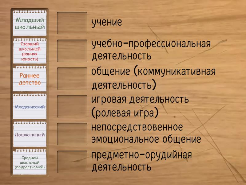 Младенческий - непосредствовенное эмоциональное общение, Раннее детство - предметно-орудийная деятельность, Дошкольный - игровая деятельность (ролевая игра), Младший школьный - учение, Средний школьный (подростковый) - общение (коммуникативная деятельность), Старший школьный (ранняя юность) - учебно-профессиональная деятельность,
