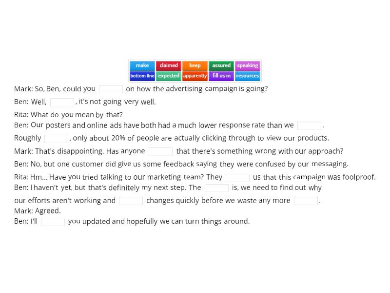 Mark: So, Ben, could you ____ on how the advertising campaign is going? Ben: Well, ____, it's not going very well. Rita: What do you mean by that? Ben: Our posters and online ads have both had a much lower response rate than we ____. Roughly ____, only about 20% of people are actually clicking through to view our products. Mark: That's disappointing. Has anyone ____ that there's something wrong with our approach? Ben: No, but one customer did give us some feedback saying they were confused by our messaging. Rita: Hm... Have you tried talking to our marketing team? They ____ us that this campaign was foolproof. Ben: I haven't yet, but that's definitely my next step. The ____ is, we need to find out why our efforts aren't working and ____ changes quickly before we waste any more ____. Mark: Agreed. Ben: I'll ____ you updated and hopefully we can turn things around.