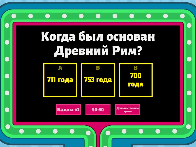1) Когда был основан Древний Рим? a) 711 года b) 753 года c) 700 года 2) Когда Древний Рим достиг пика своего могущества? a) в 3 веке н.э b) во 2 веке н.э c) в 5 веке н.э 3) Когда изгнали этрусских королей? a) в 473 году до н.э b) в 509 году до н.э c) в 547 году до н.э 4) Когда был проложен 1 водопровод? a) в 312 году до н.э b) в 494 году до н.э c) в 287 году до н.э 5) Когда была проложена 1 мощенная Аппнева дорога? a) в 358 году до н.э b) в 312 году до н.э c) в 300 году до н.э