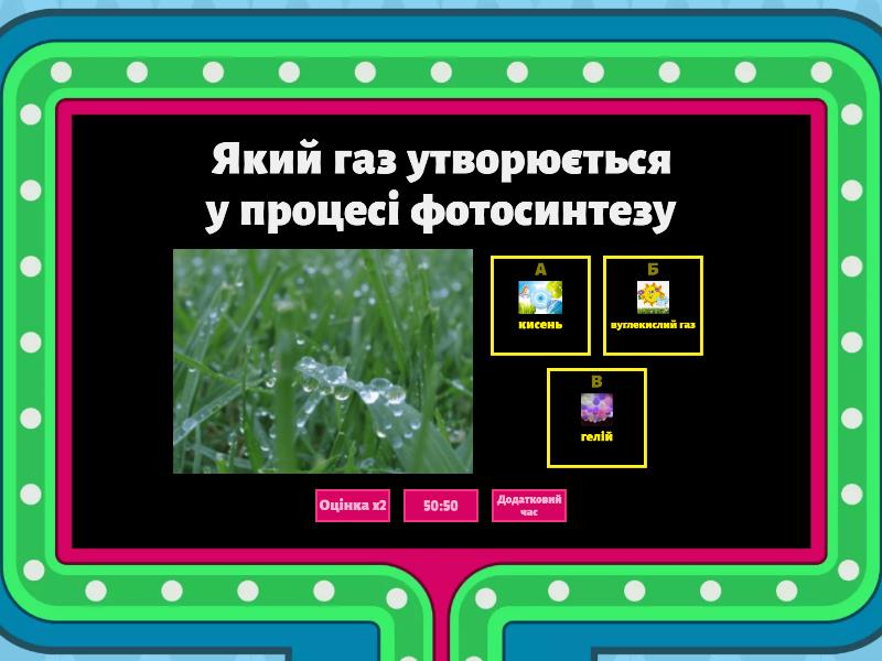 1) Який газ утворюється у процесі фотосинтезу a) кисень b) вуглекислий газ c) гелій 2) Звідки поглинається вуглекислий газ? a) з повітря b) з води c) з ґрунту 3) Що поглинає рослина для здійснення фотосинтезу? a) вуглекислий газ і воду b) вуглекислий газ і тепло c) тепло і вологу 4) Які рослини з’явилися першими? a) водорості b) мохи c) папороті 5) Що з’явилося раніше: папороті, мохи чи дерева? a) мохи b) дерева 6) В яких лісах росте ліана? a) тропічних b) хвойних c) листяних 7) Якого кольору нижня частина водних рослин? a) червоного b) синього c) сірого 8) Назвіть три типи викопного палива a) вугілля, нафта, природний газ b) пісок, глина, вапняки c) вугілля, граніт, нафта