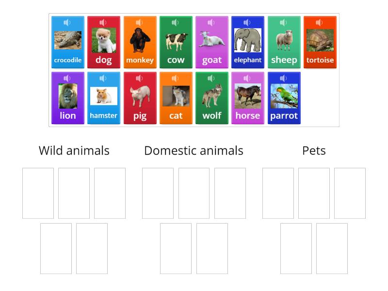 Wild animals: wolf, lion, elephant, monkey, crocodile, Domestic animals: sheep, horse, pig, cow, goat, Pets: cat, dog, parrot, hamster, tortoise,