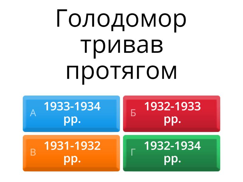 1) Голодомор тривав протягом a) 1933-1934 рр. b) 1932-1933 рр. c) 1931-1932 рр. d) 1932-1934 рр. 2) «Закон про п'ять колосків» був складовою політики: a) введення госпрозрахунку між державою та колгоспами b) передання земель заможних селян бідняцьким господарствам c) освоєння цілинних та перелогових земель d) масових репресій проти селянства 3) До чого призвела постанова РНК УСРР про занесення на «чорну дошку» колгоспів за «злісне саботування хлібозаготівель» a) конфіскації всього продовольства й посівного фонду, припинення постачання товарів b) ліквідації "куркулів" і "підкуркульників", виселення решти селян до Сибіру. c) вилучення господарського реманенту та примусове відправлення колгоспників на промислові новобудов 4) Головна причина Голодомору 1932 - 1933рр.? a) неврожай b) провал політики індустріалізації c) цілеспрямована політика вищого партійного керівництва 5) Державне сільськогосподарське підприємство a) Колгосп b) Радгосп c) Сільхозкооператив 6) Які покарання виносила надзвичайна хлібозаготівельна комісія a) Натуральні штрафи b) Грошові штрафи c) Конфіскація d) Розстріл e) Занесення на " чорну дошку" f) Відправка до Сибіру 7) айбільші людські втрати під час голодомору в Україні 1932-1933 років були у a) Одеській обл. b) Донецькій обл. c) Дніпропетровській обл. d) Харківській обл. 8) Кампанія експропріації селянських господарств у 1930-ті рр., складова частина примусової колективізації a) Індустріалізація b) Розкуркулення c) Стахановщина 9) Цілеспрямовані дії з метою знищення повністю або частково окремих груп населення чи цілих народів за національними, етнічними, расовими, корисливими або релігійними мотивами a) Голодомор 1932-1933 b) Геноцид c) Марксизм 10) Філософія пролетаріату, теоретичне обґрунтування комунізму, наука про закономірності розвитку суспільства та мислення a) Націона́л-соціалі́зм b) Фашизм c) Марксизм